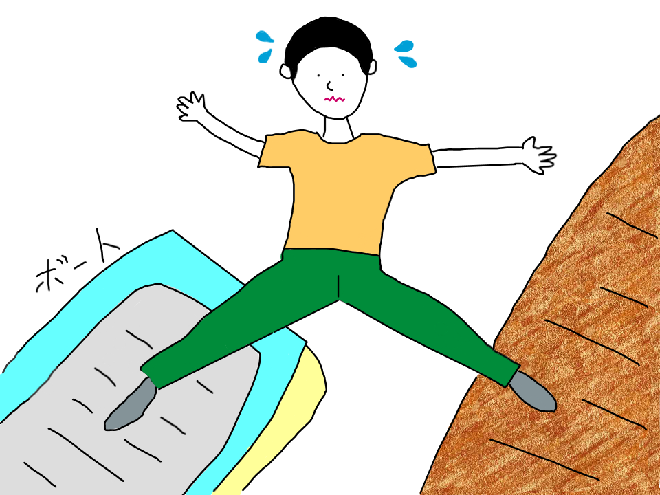 このままずっと漂っていたい。そんな思いもあったが、のりおとの勝負があるためそうも言っていられない。俺はボートを降りるために船着き場へ戻った。重い腰を上げ、ボートから桟橋の方に左足を移動させる。その瞬間、嫌な予感がした。右足が残ったままのボートが桟橋からどんどん離れていくのだ。なんとか右足を桟橋の方に移そうとするが、踏ん張る力で余計にボートが離れていく。