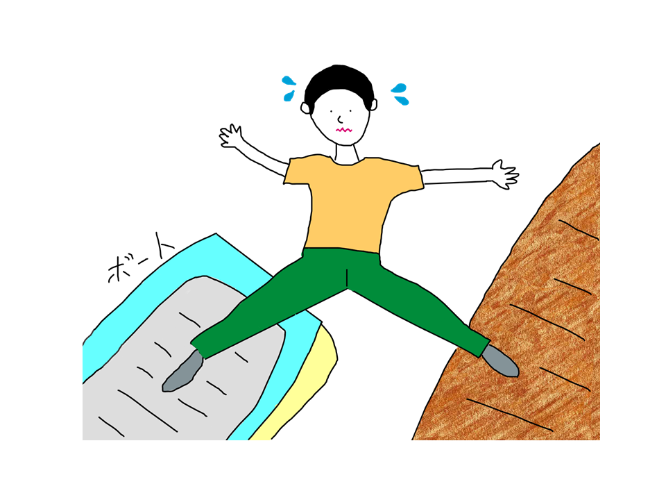 このままずっと漂っていたい。そんな思いもあったが、のりおとの勝負があるためそうも言っていられない。俺はボートを降りるために船着き場へ戻った。重い腰を上げ、ボートから桟橋の方に左足を移動させる。その瞬間、嫌な予感がした。右足が残ったままのボートが桟橋からどんどん離れていくのだ。なんとか右足を桟橋の方に移そうとするが、踏ん張る力で余計にボートが離れていく。